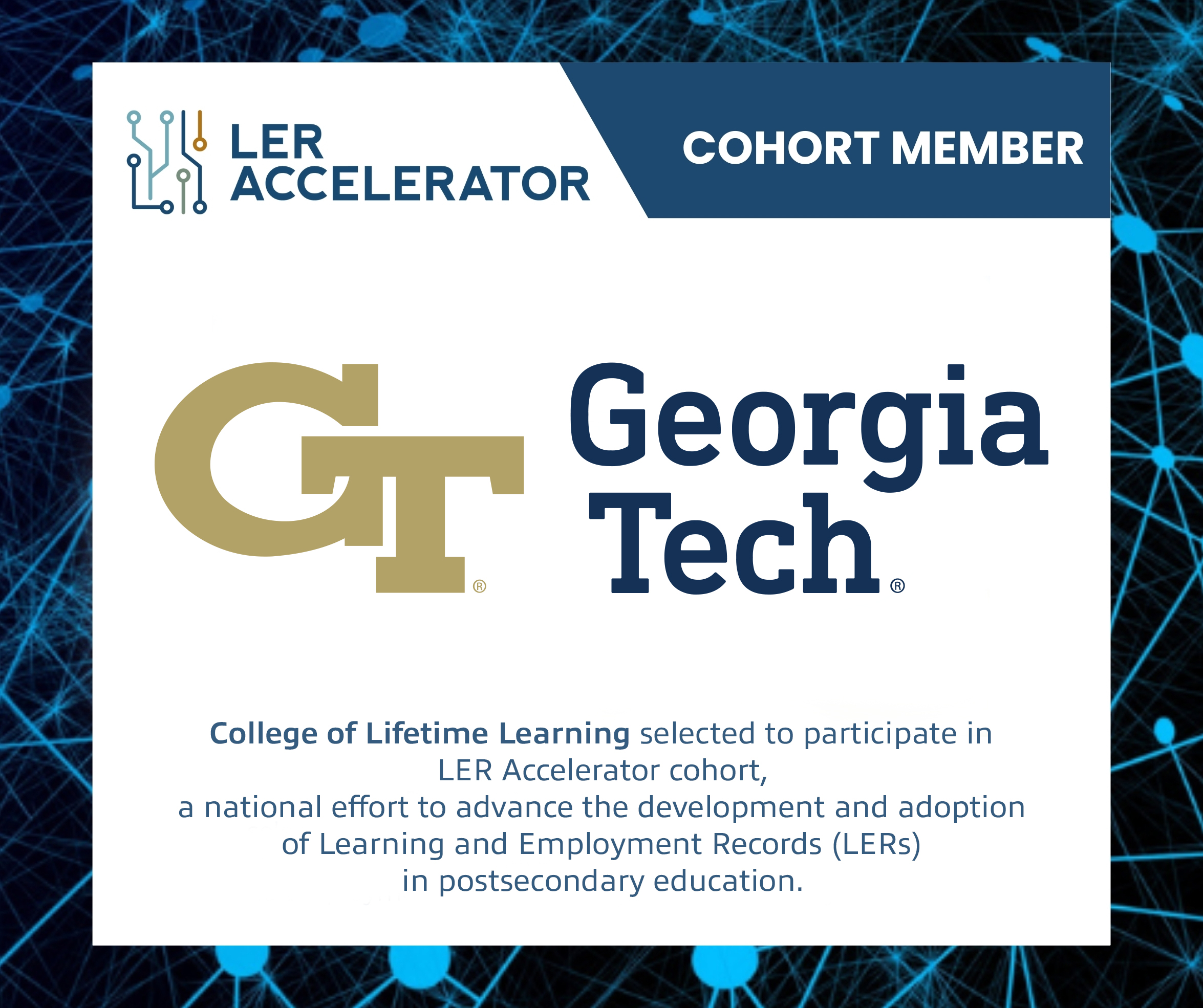 Georgia Tech College of Lifetime Learning is proud to announce its selection to join the inaugural cohort of the LER Accelerator, a national initiative focused on advancing accessible, interoperable Learning and Employment Record (LER) systems. As one of just 25 projects nationwide chosen for participation, the project will help pioneer innovative approaches to digital credentialing that enhance opportunities, learner agency, and skills-based recognition.